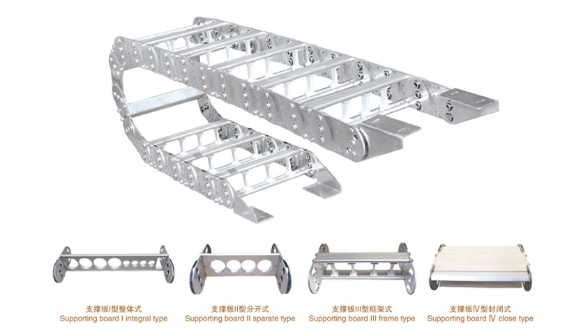 鋼制拖鏈分為四種類型:支撐板Ⅰ型整體式、支撐板II型分開式、支撐板III型框架式、支撐板IV型封閉式 。