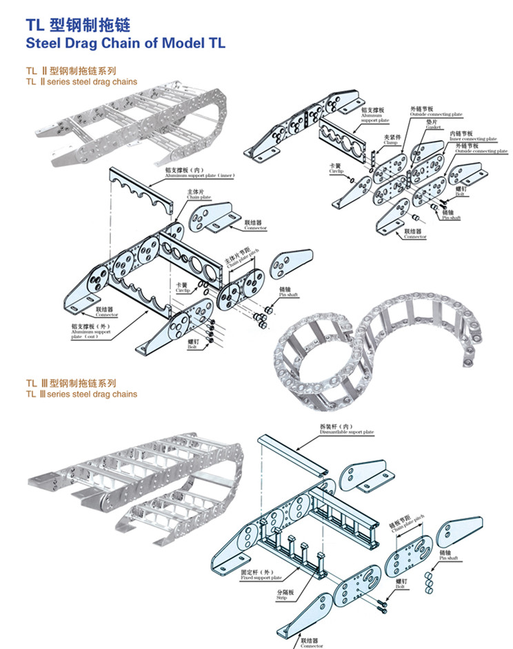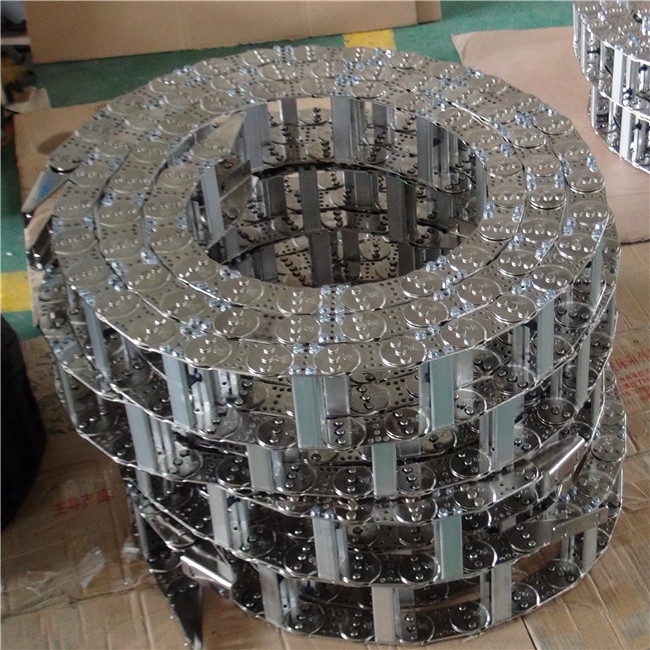 由鏈板(優質鋼板鍍鋅)支撐板(擠拉鋁合金)軸銷(合金鋼)等部件組成,使電纜或橡膠管與拖鏈之間不產生相對運動,不產生扭曲變形,鋼性能好不變形,安裝方便,使用可靠,易拆裝 ,尤其是鋼制拖鏈采用了高強度耐磨材料,合金鋼為軸銷,提高了產品的耐磨強度,彎曲更靈活,阻力更小,降低了噪音,從而可保證長時間運行下不變形。