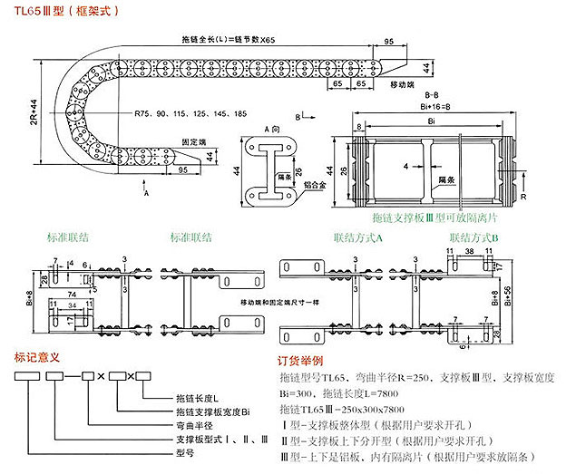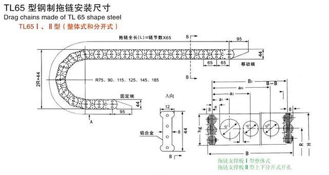 TL65型鋼制拖鏈安裝尺寸:2R+44(R=75/90/115/125/145/180); 拖鏈全長(L)=鏈節數x65; 鋁合金:44;拖鏈支撐板:I型整體式和II型上下分開式開孔