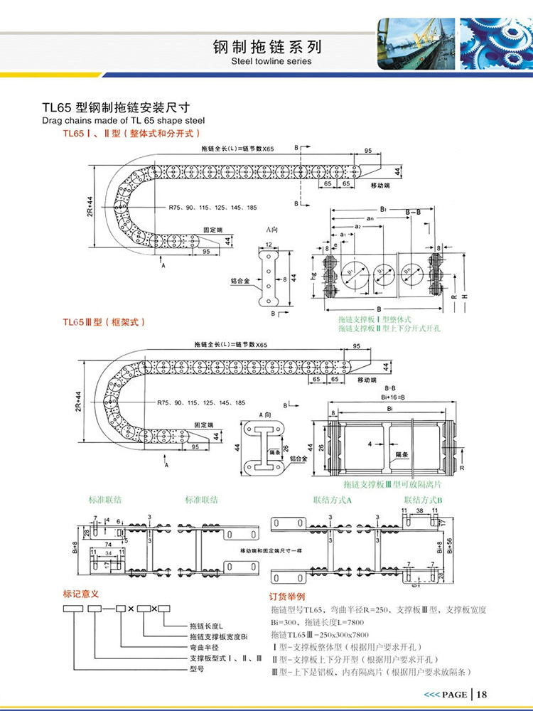 拖鏈型號TL65,彎曲半徑R=250,支撐板Ⅲ型,支撐板寬度Bi=300,拖鏈長度L=7800