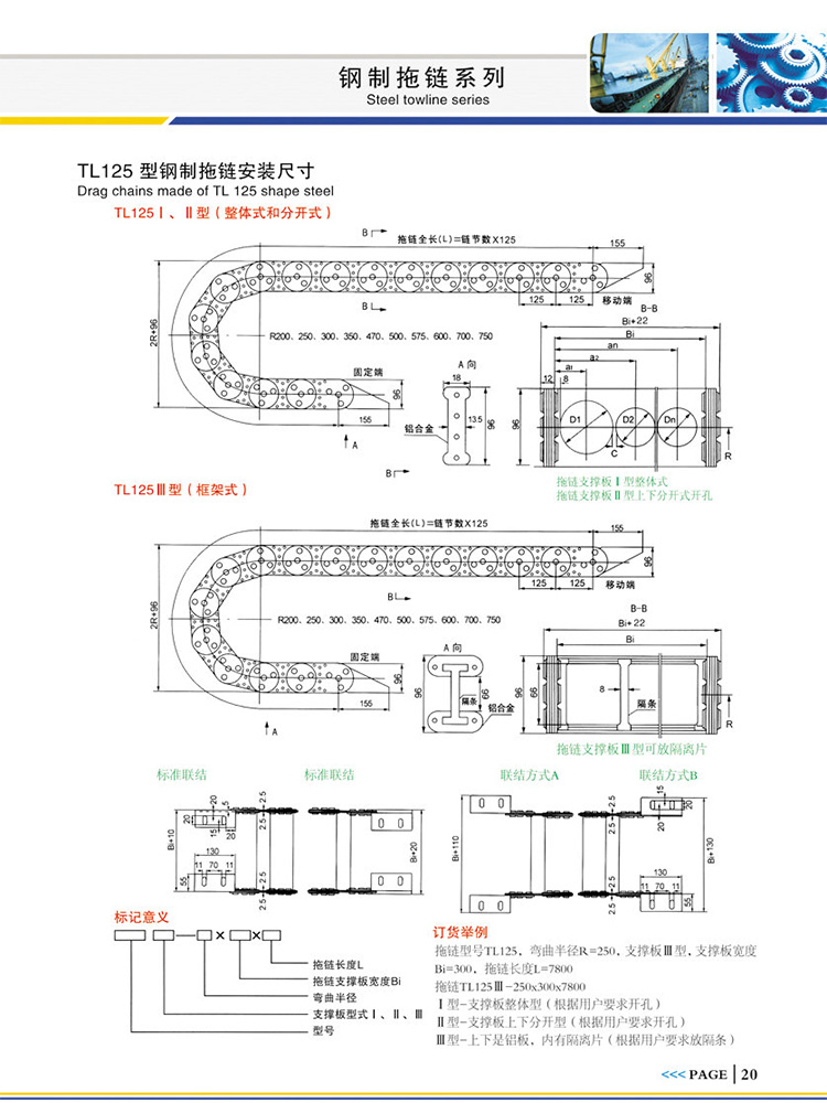 拖鏈型號TL125,彎曲半徑R=250,支撐板Ⅲ型,支撐板寬度Bi=300,拖鏈長度L=7500