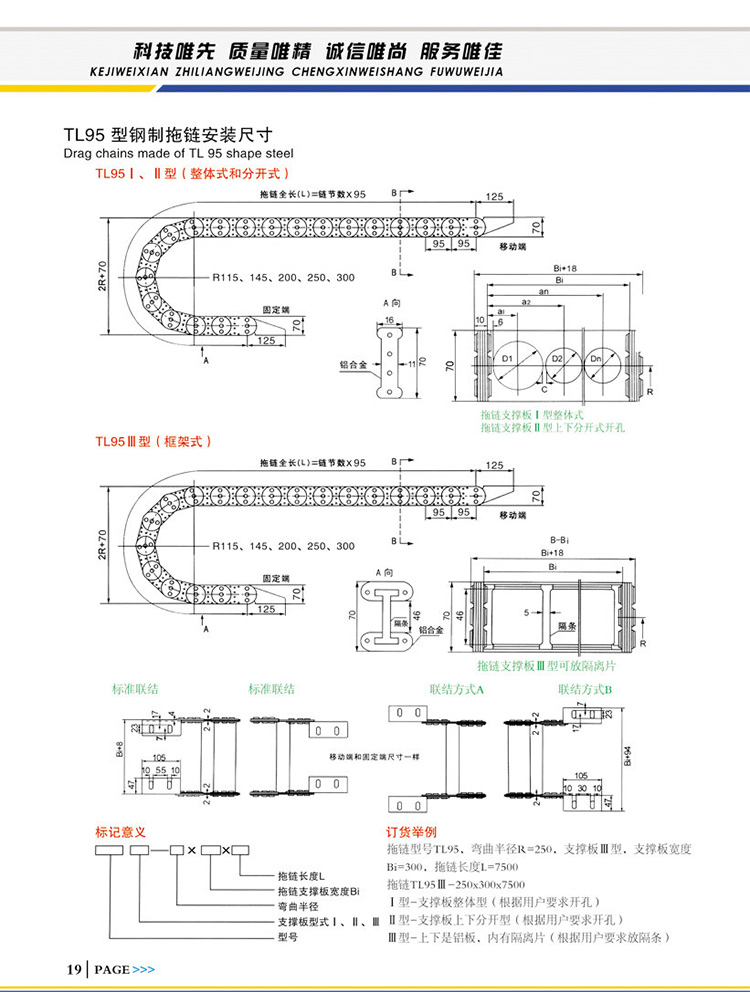 拖鏈型號TL95,彎曲半徑R=250,支撐板Ⅲ型,支撐板寬度Bi=300,拖鏈長度L=7500