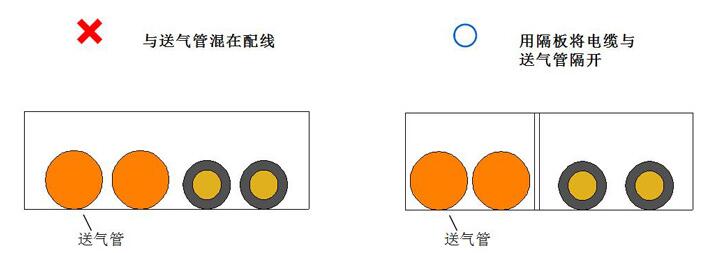 與送氣管等較硬的物體混在配線,容易造成電纜受壓斷線。