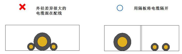 外徑差異很大的電纜如果混在配線,容易導致細線被粗線壓迫,造成細線容易斷線。這時需要用隔板將不同直徑大小的電纜隔開。