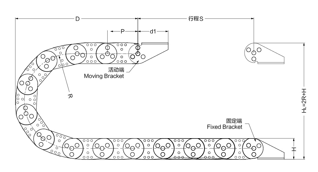 型號(hào) 節(jié)距T 彎曲半徑(可任意)R 拖鏈最小寬度 拖鏈高度H 拖鏈長度(可任意)L 支撐板最大孔D1 最大限度不加支撐長度范圍