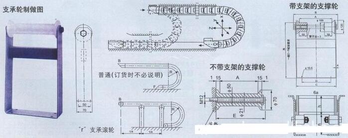 鋼制拖鏈設(shè)計參數(shù):節(jié)距,彎曲半徑,拖鏈寬度,拖鏈長度,支撐板形式。